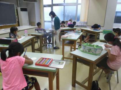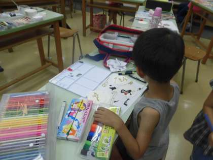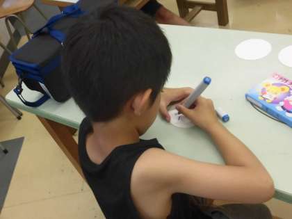 コースター作りは、みんな真剣です。マジックや色鉛筆で、ていねいにイラストを描いていました。