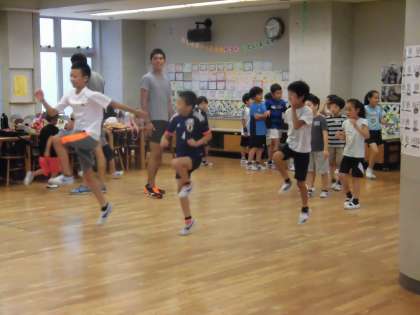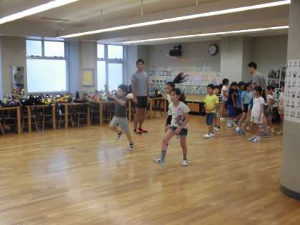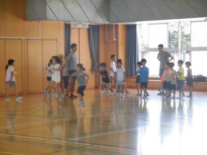 現役選手のお手本に、子どもたちは目を丸くしていました。場所を変えて、第一体育館に移動し、教わったことを試しながら走ってみました。