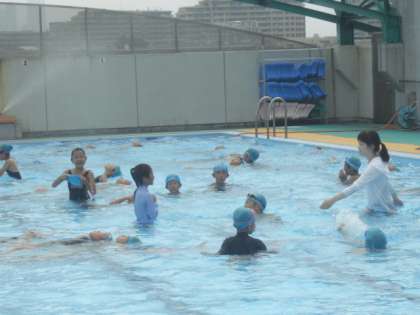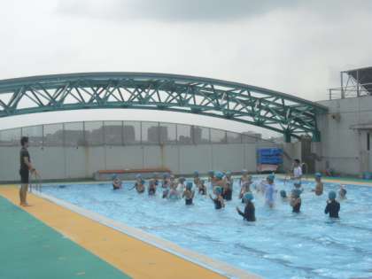 2日間中止になっての水泳指導初日。1回目の指導は、3・4年生です。真夏の熱い日差しもそこそこで、時折吹く風が心地よく、子どもたちは久しぶりのプールを楽しでいました。しかし、水温も高いので、熱中症対策として、こまめに水分補給をしたり、ホースで水をまいたりして対応しています。
