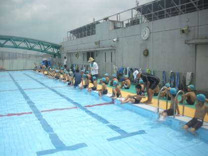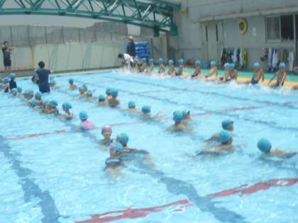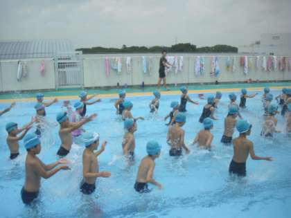いよいよ入水です。しっかり約束を守って入ります。水慣れは、恒例になっている『エビカニクス』でダンスです。子どもたちは大はしゃぎです。