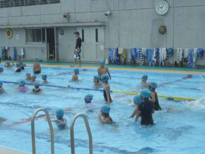 今朝も気温が下がり、水泳指導を実施することができました。1回目は低学年です。ダイナミックな音楽や、スポーツテストの音源を使って水慣れを行い、子どもたちは楽しく活動していました。曇り空で少し蒸し暑く、水温も高めでしたので、必要に応じて水分補給をしながら取り組みました。引き続き、来校する際には水筒を持参させていただきますようお願いします。