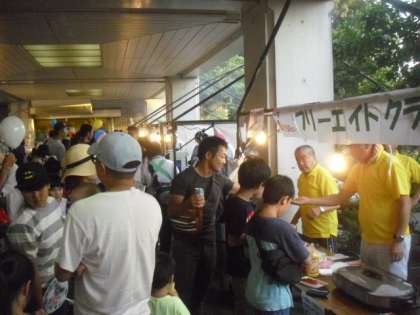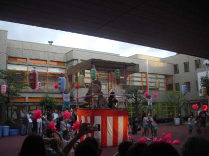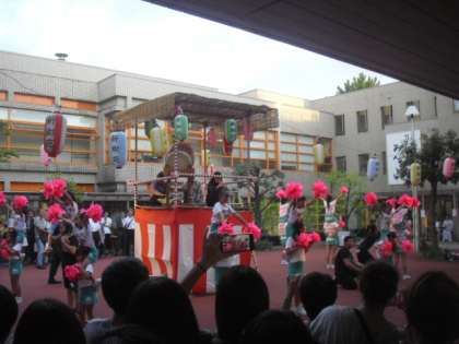 前日の台風で順延となった、八幡山町会主催による「新樹苑」の盆踊り大会が開催されました。オープニングでは、本校で活動しているチアリーディングチームの演技が披露され、盛大にスタートしました。出店もたくさん出ており、八幡山小学校の子どもたちもたくさん訪れて、夏休みの楽しいひとときを過ごしていました。