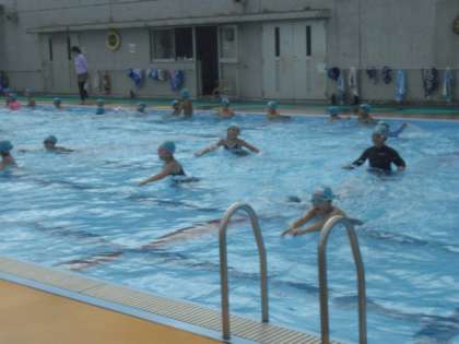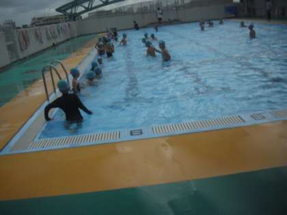 今日の水泳指導の1回目は、中学年で行われました。今朝は、台風の影響もあってか、水温が少し下がり、厚い雲によって日差しもきつくなく、プールに入るにはちょうどよい感じだったようです。先生の号令の下、音楽に合わせて水慣れを行い、横のコースを使って、繰り返し各種泳法の練習に励んでいました。