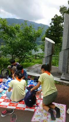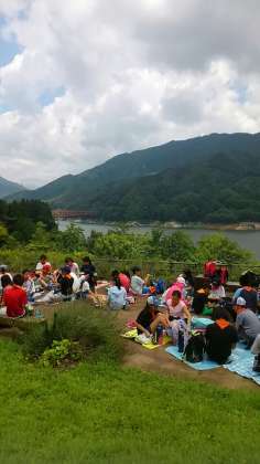 先に美術館脇の草原で昼食を、とりました。ダムのある草木湖の見える絶景ポイントでのお昼でした。