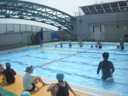 暑さが厳しくなってきた中、2回目の中学年の指導を行いました。27名の児童が参加しました。水温の上昇を避けるために、プールに注水を続けながら指導を行い、プールサイドは、乾いて熱くならないように常に水をまくなどの対処をしました。