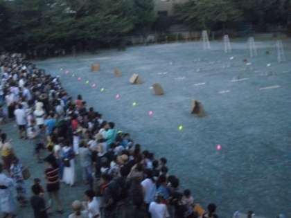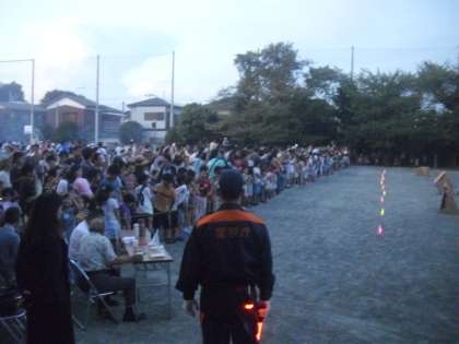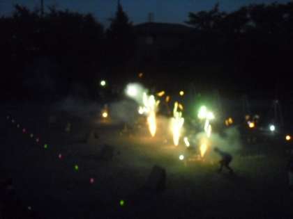 お待たせしました。打ち上げ花火の始まりです。来賓挨拶と諸注意が行われ、いよいよ着火です。おやじの会の皆さんが、一斉に仕掛けた花火に火をつけします。