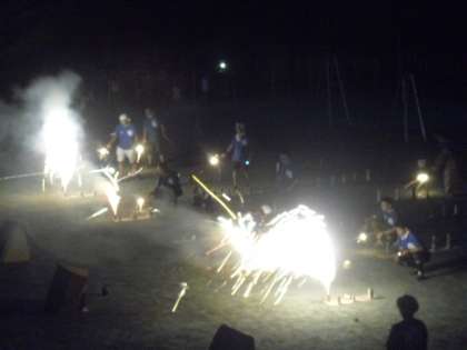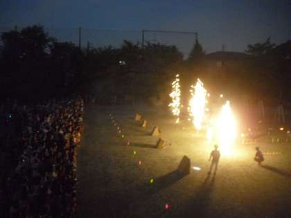 次から次へと、色とりどりの花火が夜の校庭を照らします。来場者から大歓声が上がりました。