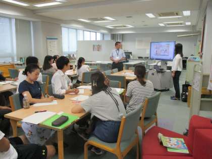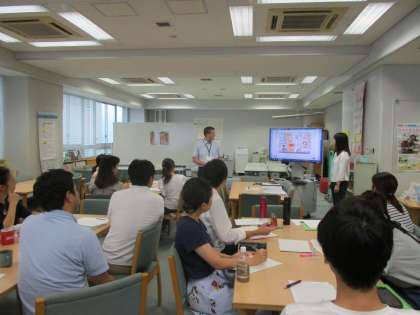 2学期を来週に控え、先生たちは外国語の授業を充実させるためにの実技研修を、外部講師を招いて行いました。子どもたちが英語に親しみ、楽しく授業に参加できるような、さまざまなアクティビティーを紹介していただき、先生方も実際に取り組むことによって、課題のねらいを実感しました。2時間しっかり行い、充実した研修の時間となりました。