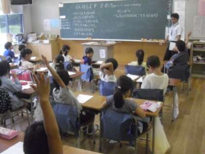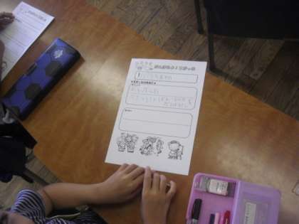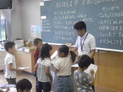 1年生の教室でも、2学期のめあてについて、先生と一緒に考えながら決めていました。まずは、どんなことをがんばりたいか、みんなで意見を出し合います。その後で、それぞれがカードにまとめて、先生に確認してもらっていました。長い2学期ですので、しっかり最後まで意識して取り組んでくださいね。