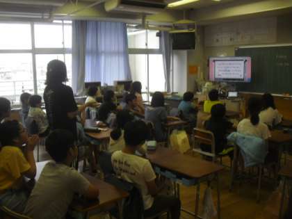 高学年の教室では、火曜と金曜の朝は英語のモジュール授業です。DVDの映像などを使って、楽しく英語に親しみます。子どもたちは活動にもだいぶ慣れ、分かっていることが増えたことで積極的に発言する姿が見られていました。