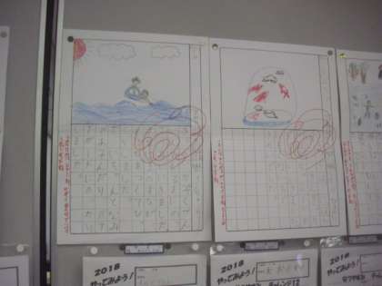 1年生の教室には、夏休みの宿題の絵日記が掲示されていました。どの作品も、楽しかった夏の思い出が書かれていて、とても充実した夏休みだったことがうかがえました。