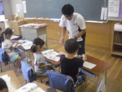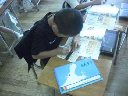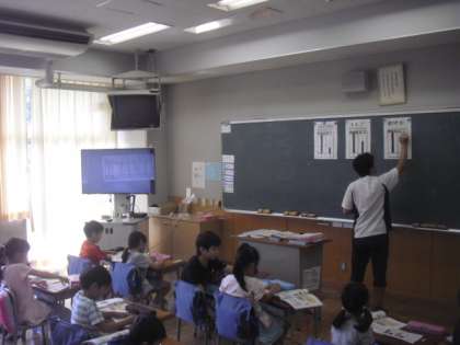 1年生の算数の授業は、「10より大きい数」の学習です。増えた数をグラフにして考えます。課題のワークシートにていねいに書けた子どもたちは、担任の先生からシールをもらってがんばっていました。