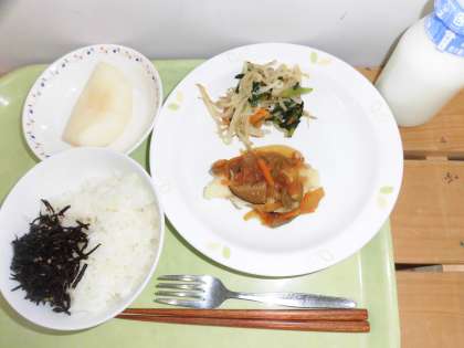 「ごはん、ひじきのふりかけ、白身魚の甘酢あんかけ、野菜の辛子醤油かけ、梨、牛乳」です。