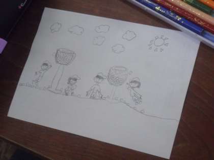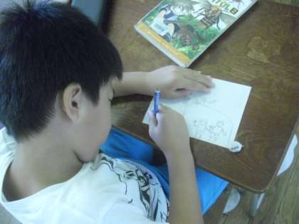 運動会のプログラムの表紙の絵を、2年生が描きました。玉入れやリレーなど、子どもたちがそれぞれに思い描く運動会のイメージを、自由に表現します。どの子もみんな素敵な絵を描いていて、プログラムに使う代表作品を選ぶのに困りそうです。