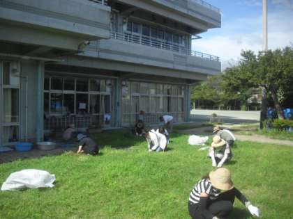 土曜授業日の放課後、10月の運動会に向けて、八幡山小学校運営委員会とPTAの主催で、裏庭の芝生の整備、並びに雑草取りを行っていただきました。今年は異常なまでの猛暑で、7月の活動を中止しましたが、今日も30度を超す中、たくさんの保護者の皆さんにご協力いただきました。