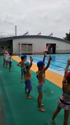 八幡山幼稚園の年長組さんは、八幡山小学校のプールに入りました。大きなプールに、ちょっとドキドキしましたが、プールサイドで元気に準備体操も出来ました。