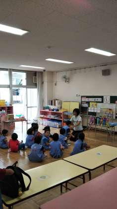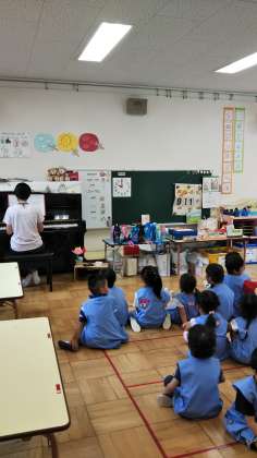 八幡山幼稚園の年少組の朝の様子です。お誕生会に向けて、歌の練習をしていました。今日は、8月生まれのお友達のお誕生会です。大きな声で、元気に歌いましょう。