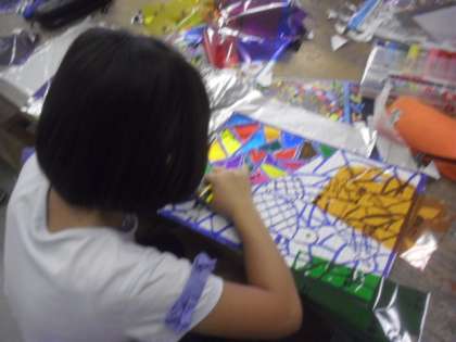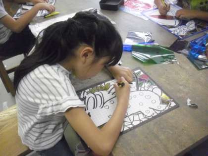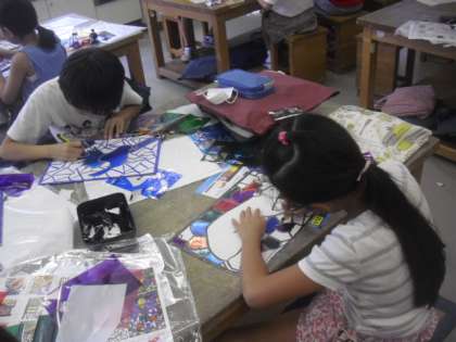 2組の3・4校時の図工の時間は、展覧会に飾る作品作りです。カッターを使って模様を切り取り、ステンドグラス風の作品に仕上げます。題して「ひかりのかたち」です。光にかざすときれいに図柄が浮び上がり、子どもたちはとてもうれしそうでした。