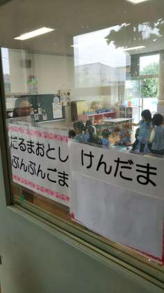 敬老参観の2階のすみれ組の部屋では、だるま落としやけん玉で遊びました。