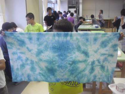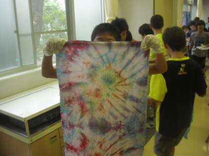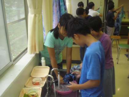 5年生は家庭科の時間に、展覧会に出品するクッションのカバーの生地を染める作業をしました。「輪ゴム絞り染め」と「タイダイ染め」の2種類から子どもたちが選び、好きな色で染めます。友達同士で協力しながら手際よく進め、素敵な模様に仕上がりました。出来上がりに、とても満足そうな表情で生地を見せてくれました。