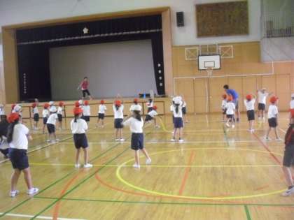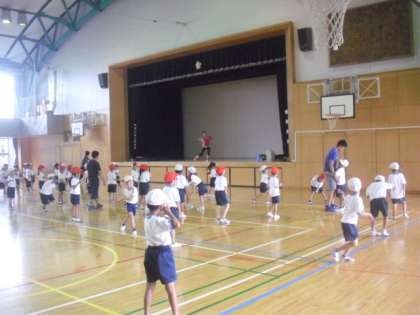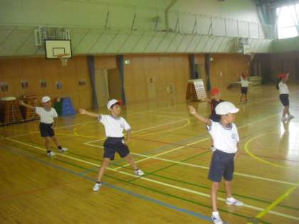 今日も体育館では、1年生が運動会の表現ダンスの練習をしました。高校野球のテーマソングに合わせて、投げる・打つなどの野球の動きを取り入れた格好のよいダンスです。一生懸命に練習すれば、きっと「えいかんはきみにかがやく」ことになると思います。がんばって練習に励みましょうね。