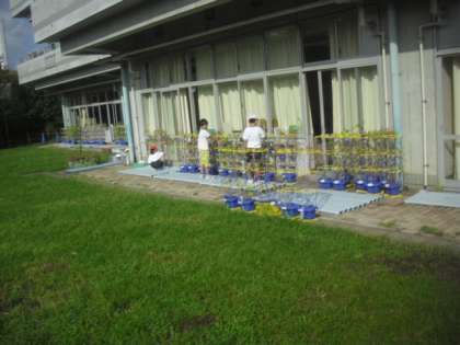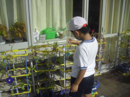 登校してきた1年生が、教室の外にあるアサガオの鉢に水やりをしていました。自分の身支度をしたり、運動会の練習で体育着に着替えをしたりと、朝の慌ただしい中でも、きちんと植物のお世話を忘れずにするところはとても感心します。その甲斐もあって、今朝はいくつものきれいな花が咲いていました。