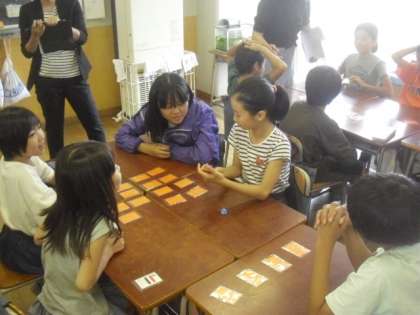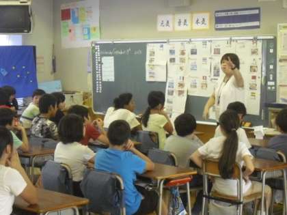 2学期最初の校内研究授業が、5年2組で行われました。今日は、“I want to go to Italy.”の単元で、行ってみたい国や地域、やりたいことなどの言い方を知る学習です。根岸教諭は、チャンツや国名カードゲームを使って、楽しく学習活動を進めました。