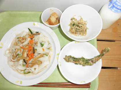 「きしころ(冷やしきしめん)、ししゃもの磯部揚げ、ごま酢かけ、月見団子、牛乳」です。