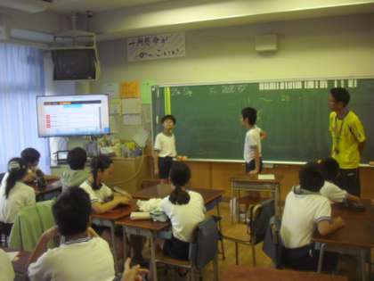 運動会の朝練などで忙しくても、金曜日の朝の5・6年生のは、外国語活動のモジュール授業です。今朝もDVDを見ながら学習したり、子どもたちが実際に英語でやりとりしたりして、15分間の授業が進められました。子どもたちも授業に慣れて、積極的に取り組む様子が見られました。
