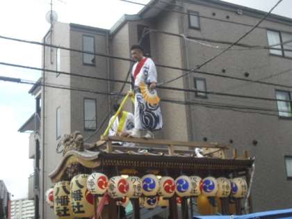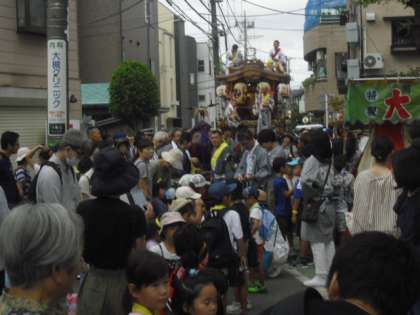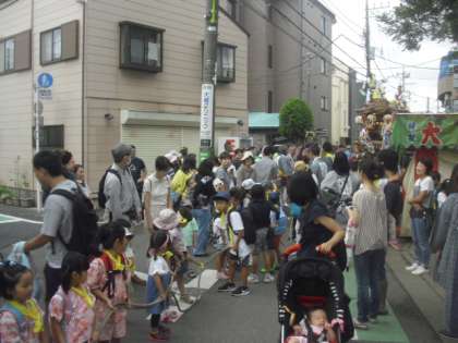 大きな山車は住宅の屋根に届きそうな位の高さで、町会の方が声をかけて誘導しています。子どもたちの側には保護者の方々が付き添って同行しました。