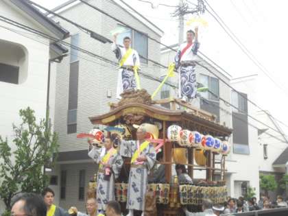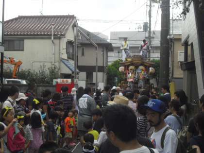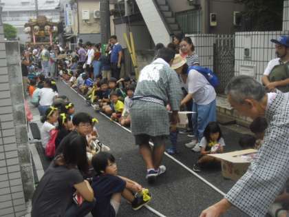 狭い路地を進む山車は、住宅の屋根に届きそうな位の高さで、町会の方が声をかけて誘導しています。山車を引く子どもたちの楽しみは、各所でふるまわれる飲み物やお菓子のようです。引き続き、山車と神輿は順調に町内を廻ります。
