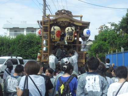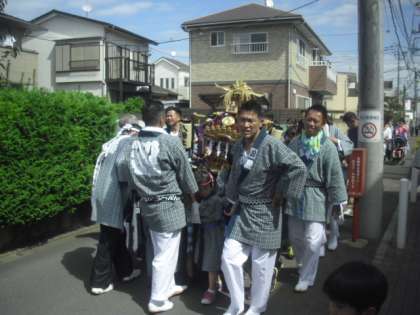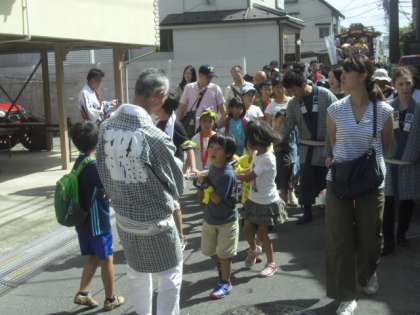 一行は順調に町内を廻っています。少し日差しが厳しくなっているので、担ぎ手の方々た子どもたちも大変です。