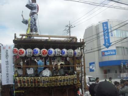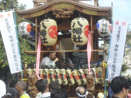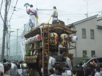 山車でお囃子を演奏しているのは、八幡山町会青年部のお囃子会の子どもたちです。今年は5年生がたくさん参加して、演奏しています。とても凛々しい姿が見られました。