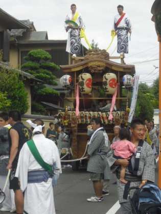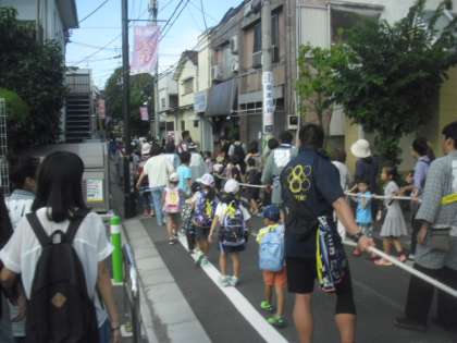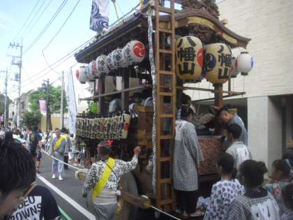 再度出発です。商店街を通って、八幡山の駅の方に向かいます。交通規制も大変です。安全に注意しながら、巡行は続きます。