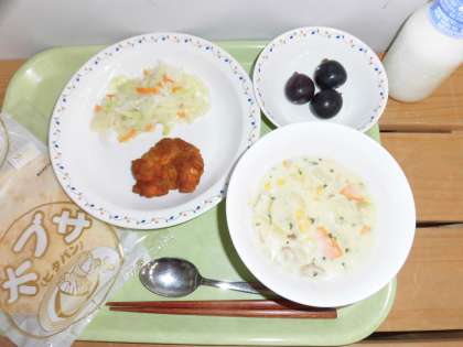 「ホブサ、タンドリーチキン、キャベツサラダ、ポテトシチュー、巨峰、牛乳」です。
