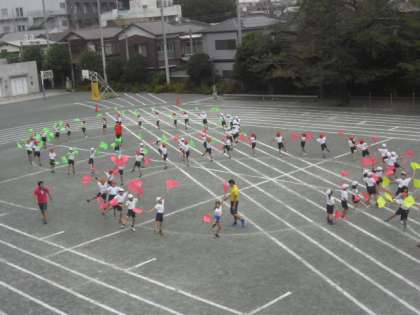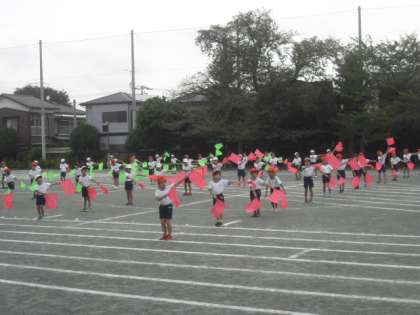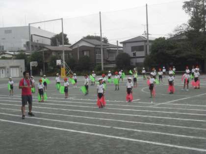 1時間目、2年生が校庭で運動会練習を行いました。「世田谷でいやほい」を旗を持って踊り、隊形移動の練習もできました。今にも雨が降りそうな中、3色のきれいな旗が鮮やかに舞っていました。