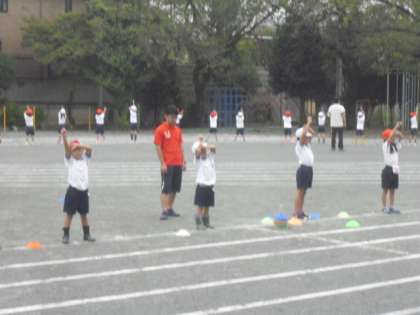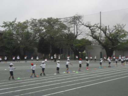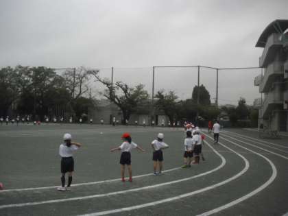 今日も朝からはっきりしないお天気ですが、1時間目は1年生が、運動会のダンスの練習を校庭で行いました。「えいかんはきみにかがやく」の隊形を確認し、実際に音楽に合わせて踊りました。体育館と校庭では雰囲気が違います。広い校庭で初めて踊ってみて、子どもたちはさらに上手に踊れるようになろうと、一生懸命に練習に励んでいました。