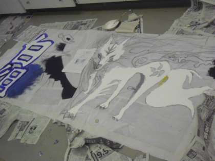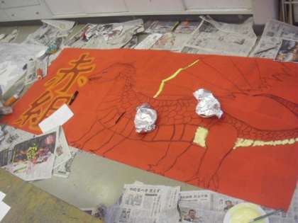 運動会の赤白のキャラクターの旗が仕上がってきました。係の児童が休み時間を使って作業をしています。完成がとても楽しみです。