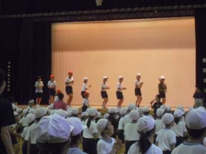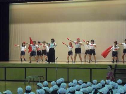 後半は応援団による応援合戦と、全校ダンス『八幡山音頭』の練習もしました。応援団の威勢のよいかけ声とともに、今日も運動会の歌『ゴーゴーゴー』を元気に歌いました。『八幡山音頭』は、初めての1年生もしっかり踊っていました。