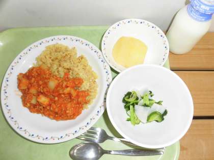 「チリビーンズライス、野菜のレモンかけ、りんご、牛乳」です。