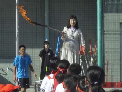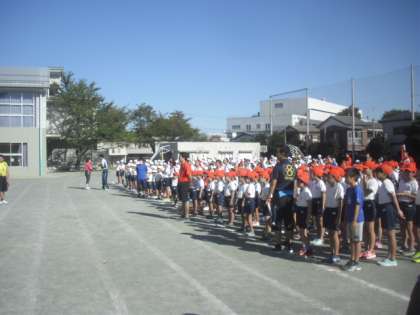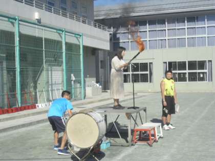 運動会の全校練習の2回目の今朝は、赤白に分かれて整列し、校長先生よりオリンピックの聖火の紹介が行われました。その後、開会式の退場と児童席移動の仕方について確認をしました。