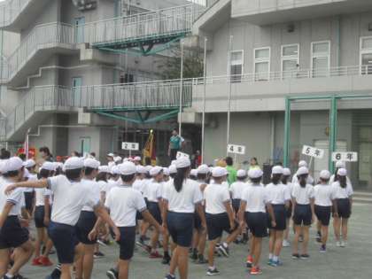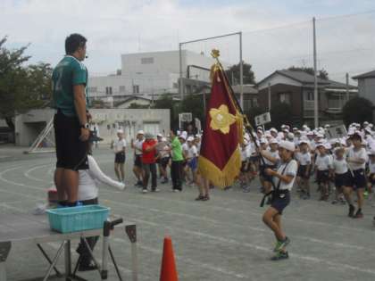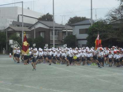 校舎を正面にして、全校児童が一斉に前進します。旗手担当の6年生もがんばって先導していました。