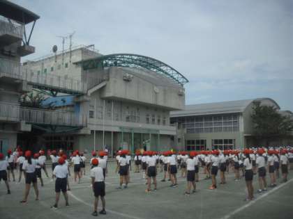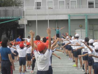 最後は、はじめの運動と終わりの運動の練習をしました。体操の体型になって、ラジオ体操とストレッチを中心とした整理運動を、利根川先生の動きに合わせて行いました。およそ1時間、全校児童がしっかり集中して取り組んでいました。