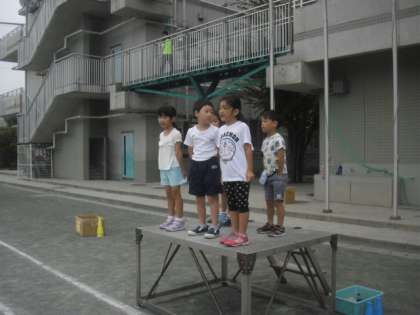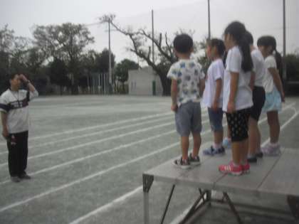 明日の運動会の開会式で、1年生の代表児童が行う「はじめの言葉」の練習が行われました。塚越先生の指導の下、実際に朝礼台の上に立って発表しました。明日の本番でも、自信をもって堂々と言ってくださいね。