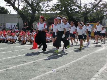 午前の部の応援合戦が始まりました。紅白どちらの応援団も気合が入っています。エールの交換をして、今日の運動会を盛り上げようと精一杯の声で応援します。子どもたちも気持ちを一つにして、元気に歌っていました。