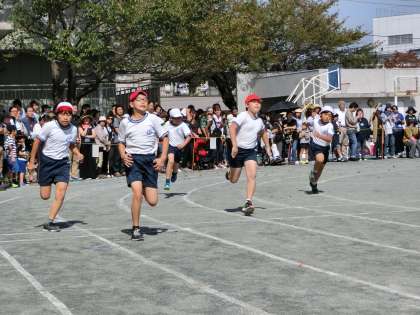 5年生の最初の種目は、短距離走100m走です。スピード全開のコーナーワークにも迫力があり、どのレースも見応えのある熱戦が繰り広げられていました。