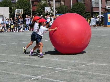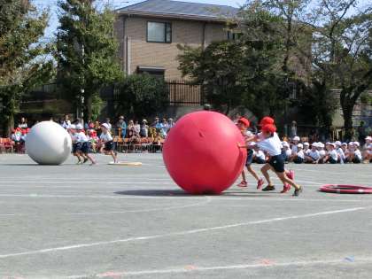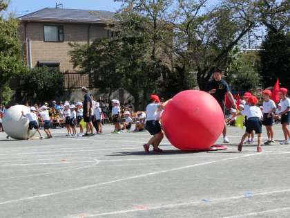 2年生の団体競技は、大玉ころがしです。3人1組でグループになって、自分より大きな大玉を協力して運びます。コーンを回って次のグループにタッチします。大玉の思わぬ動きに四苦八苦していましたが、最後まであきらめずにがんばっていました。