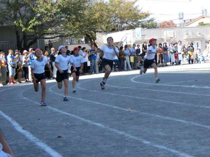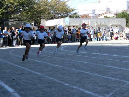 4年生の短距離走は80m走です。男女とも豪快な走りを見せ、接戦続きの見応えのあるレースになりました。