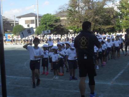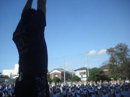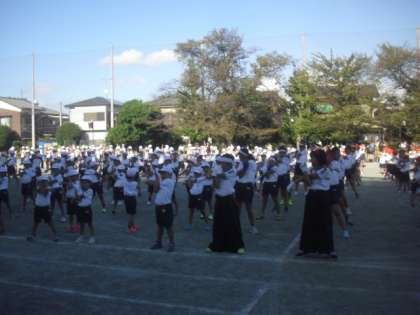 すべての競技が無事終了しました。全校児童整列をして、おわりの運動です。今日1日、たくさん身体を動かしたので、しっかり整理運動をします。