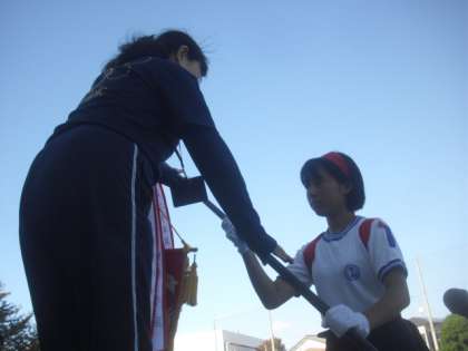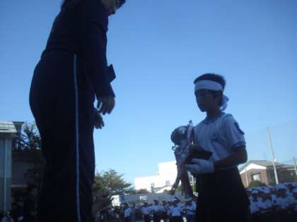 校長先生より優勝旗、準優勝カップが、紅白の応援団長に渡されました。両組とも、全力を出し切ってよくがんばりました。